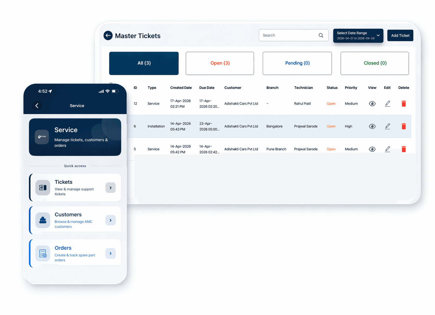 Manage AMCs, Service Tickets & Field Technicians